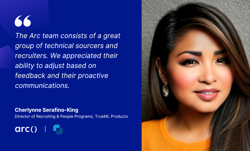 “The Arc team consists of a great group of technical sourcers and recruiters. We appreciated their ability to adjust based on feedback and their proactive communications,” said Cherlynne Serafino-King, the Director of Recruiting & People Programs at TrueML.