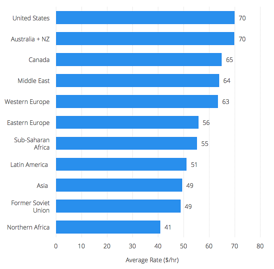 First, we wanted to understand how much average hourly rates differ in different regions throughout the world. The least expensive regions showed average rates about 30% – 40% less than the most expensive regions. Note that these are average rates across hundreds or thousands of developers, there is also considerable variation in rates within regions not shown here.