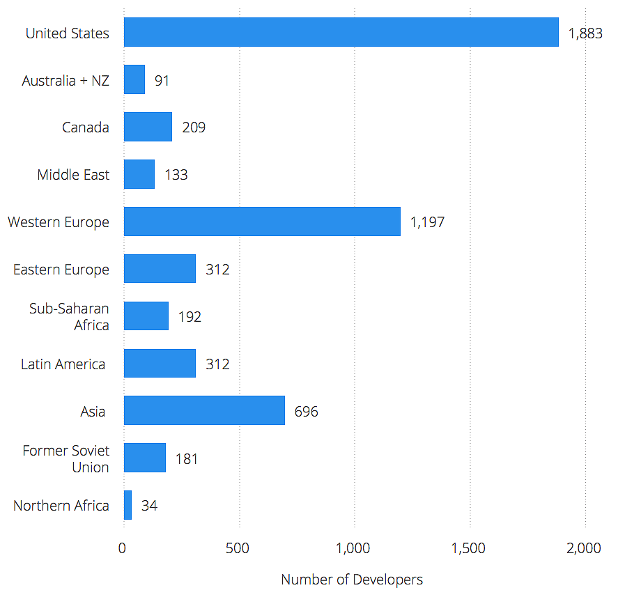 Here we show how many freelance developers were included in our survey by region. Note: There were regions where we were fortunate enough to gather many data points (e.g. United States, Western Europe), but also regions with fewer datapoints (Northern Africa, Australia + NZ). We are thankful to all developers who shared their rates with us.