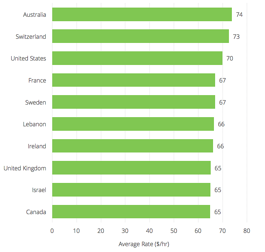 Australia had the highest average hourly rate of developers, although they only had 72 developers in the dataset (versus 1,800+ developers in the U.S.).