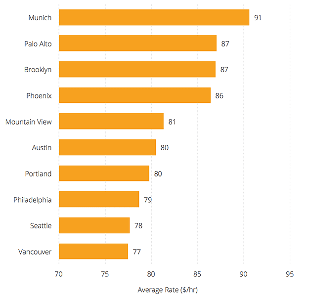 Seven of the top 10 most expensive cities had average hourly rates of over $80 per hour, with Munich in the top spot at $91 per hour.
