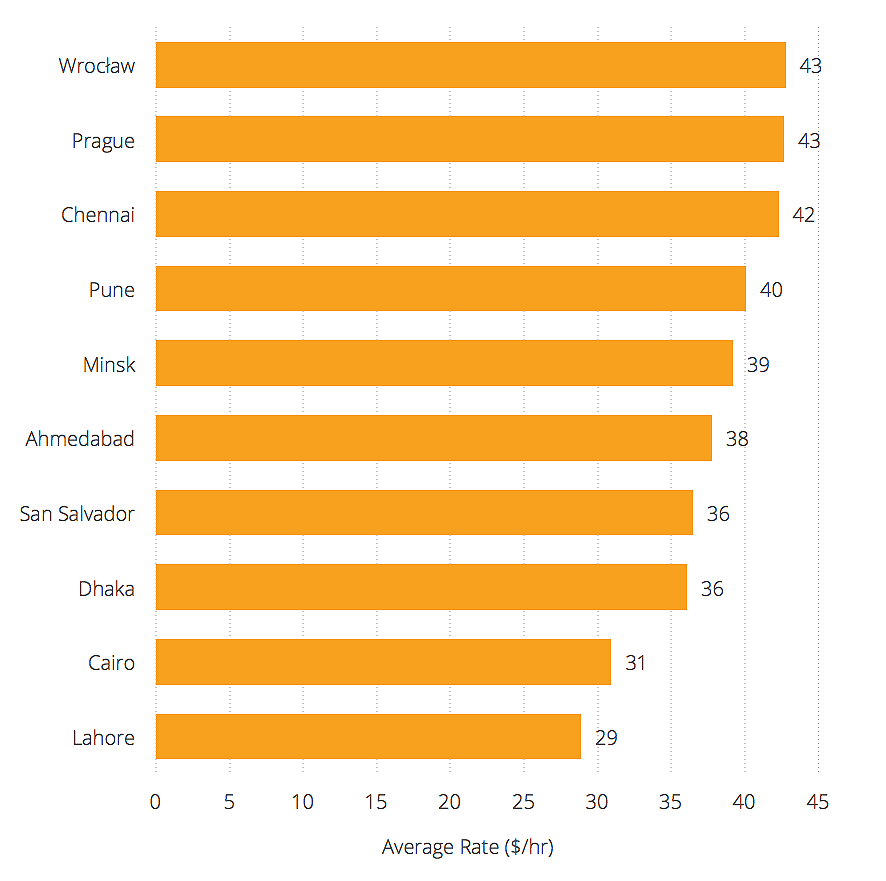 Five out of the ten least expensive cities are in South Asia, with over half of the top 10 least expensive having average rates in the $30s per hour. Also, note there were many cities with rates even lower ($20s per hour and below) but we only included cities with over ten developers listed for these rankings.
