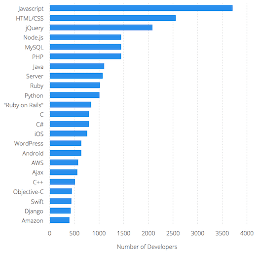 Our data shows hundreds of developers available with expertise across a wide range of languages and tech stacks. Front-end web development is the most popular, with more developers reporting expertise in JavaScript and HTML/CSS than any other tech stack by a wide margin.