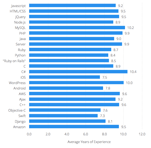 Finally, we also analyzed years of experience, shown here for the different tech stacks. It’s important to emphasize that we asked for years of experience for the developer in general, not just for that particular tech stack. So for newer tech stacks like node.js, for example, a developer may have 10 years of experience, primarily in JavaScript and added node.js to their repertoire only 2 years go. In this survey they are still recorded as having 10 years of experience.