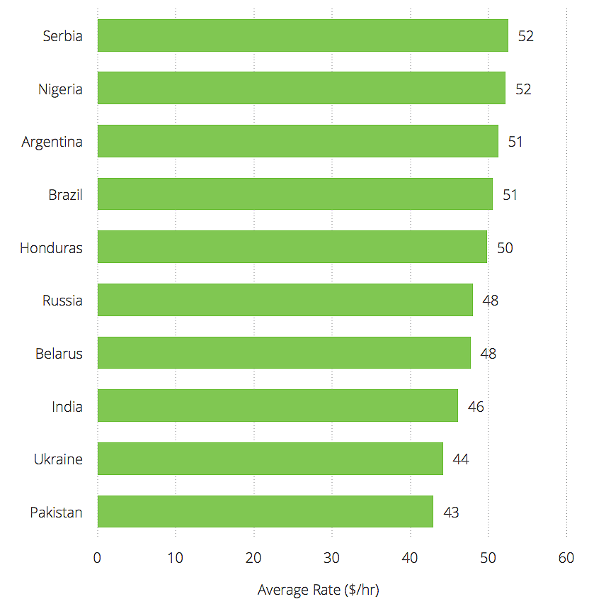 Pakistan and Ukraine have the lowest average rates of countries with at least 20 developers available. Their rates are 40% less than Australia and Switzerland.